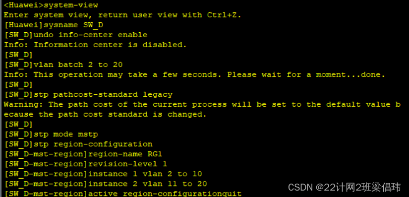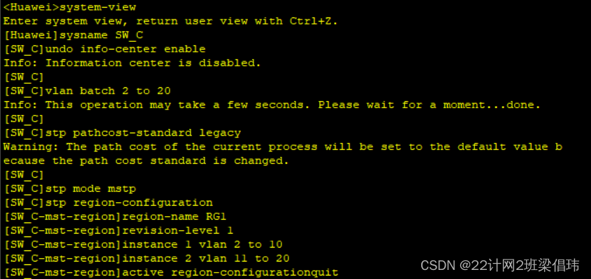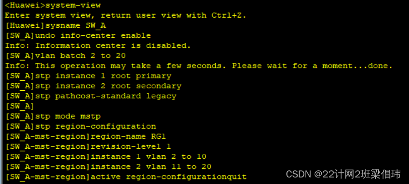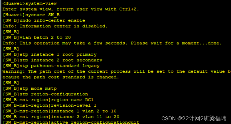 配置MSTP根桥:在单区域MSTP中,必须指定一个交换机作为根交换机。根交换机是生成树的起点,它负责将数据转发到网络中的其他交换机。通常,您可以通过配置交换机的优先级和MAC地址来指定根桥。