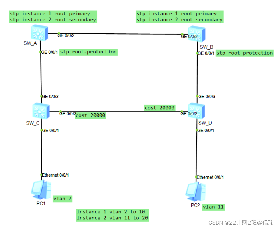 3、MRSTP:MRSTP采用了每个VLAN一棵生成树,可以将多个VLAN的生成树映射为一个实例,实现负载分担。