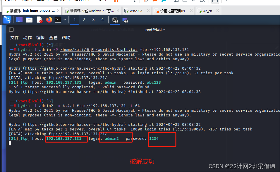(2)使用hydra工具破解目标FTP(如ftp://192.168.169.135)的密码。结果截图并作必要的说明。