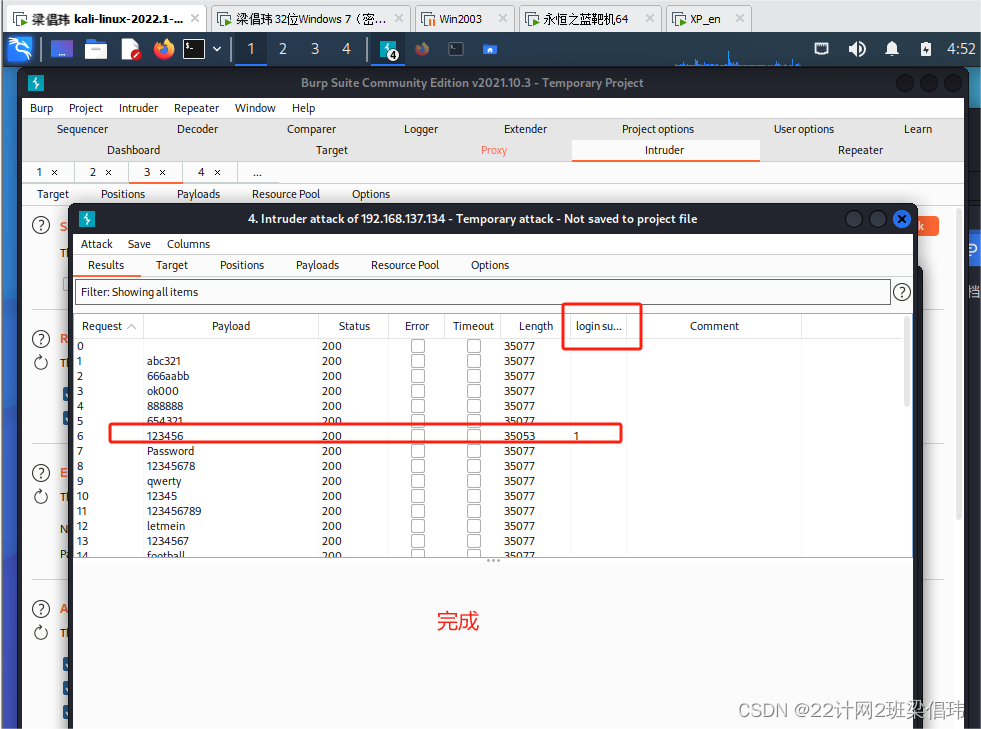 在扫描结果中找到密码(一般按照Status或者Length大小排序,就可以判断出哪个是密码)