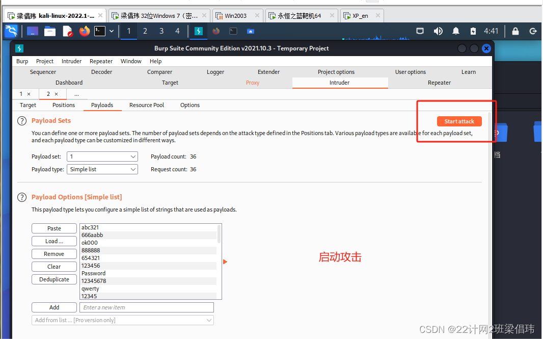 启动攻击:在菜单Intruder选择Start attack