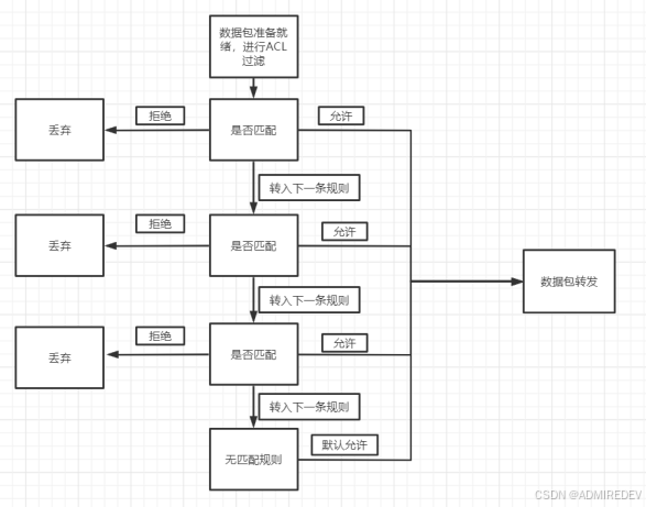 至上而下,逐一匹配,上条匹配按照上条执行,不再查看下条;在华为体系中,末尾隐含允许所有,在思科体系中,末尾隐含拒绝所有。