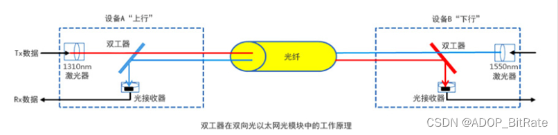 这种技术的优势在于它能够有效地简化网络布线、节省安装空间,并降低布线成本。BiDi光模块的工作原理是通过调谐双工器,使发射器和接收器的期望波长匹配,从而实现数据的双向传输。例如,配对的BiDi光模块可以连接到设备A(上行)和设备B(下行),其中光模块A的双工器具有1550nm的接收波长和1310nm的发射波长,而光模块B的双工器则相反。