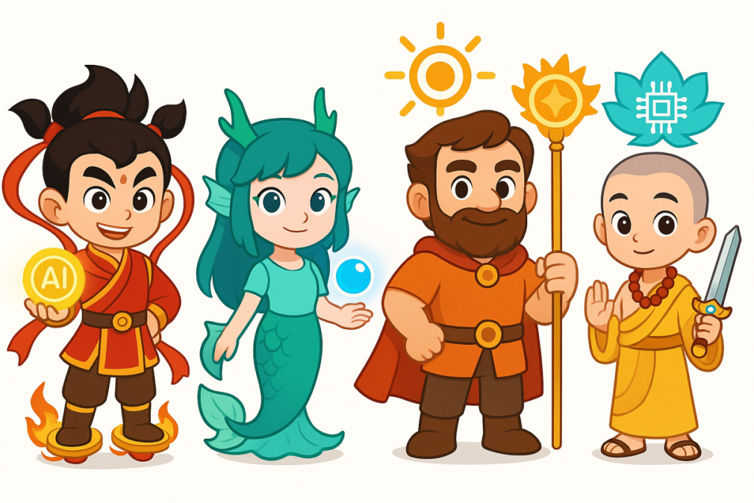 我们设定了四个角色原型,来自中国传统神话体系,包括《西游记》《封神榜》《山海经》等,目标是结合神话文化与现代AI教育特征,创造孩子喜欢、易于传播的AI虚拟角色: