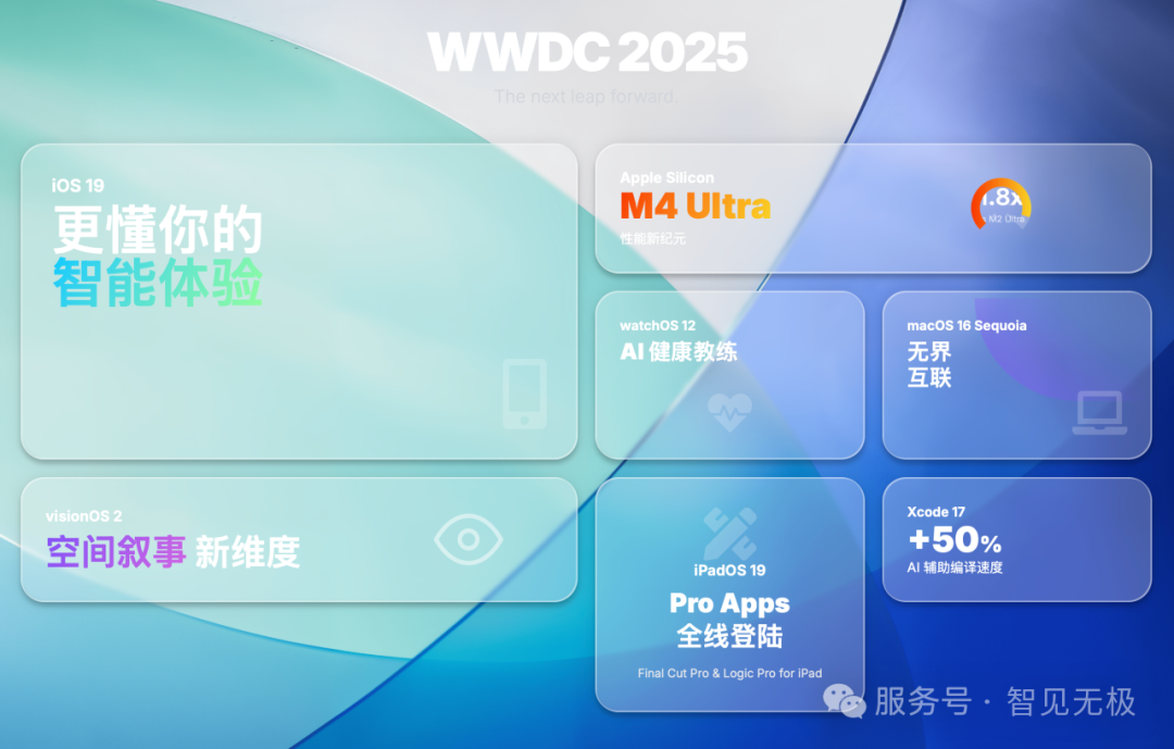 设定了一个虚构的WWDC25发布会内容,涵盖了iOS、macOS、visionOS的更新以及新款芯片,以更好地填充和展示设计。