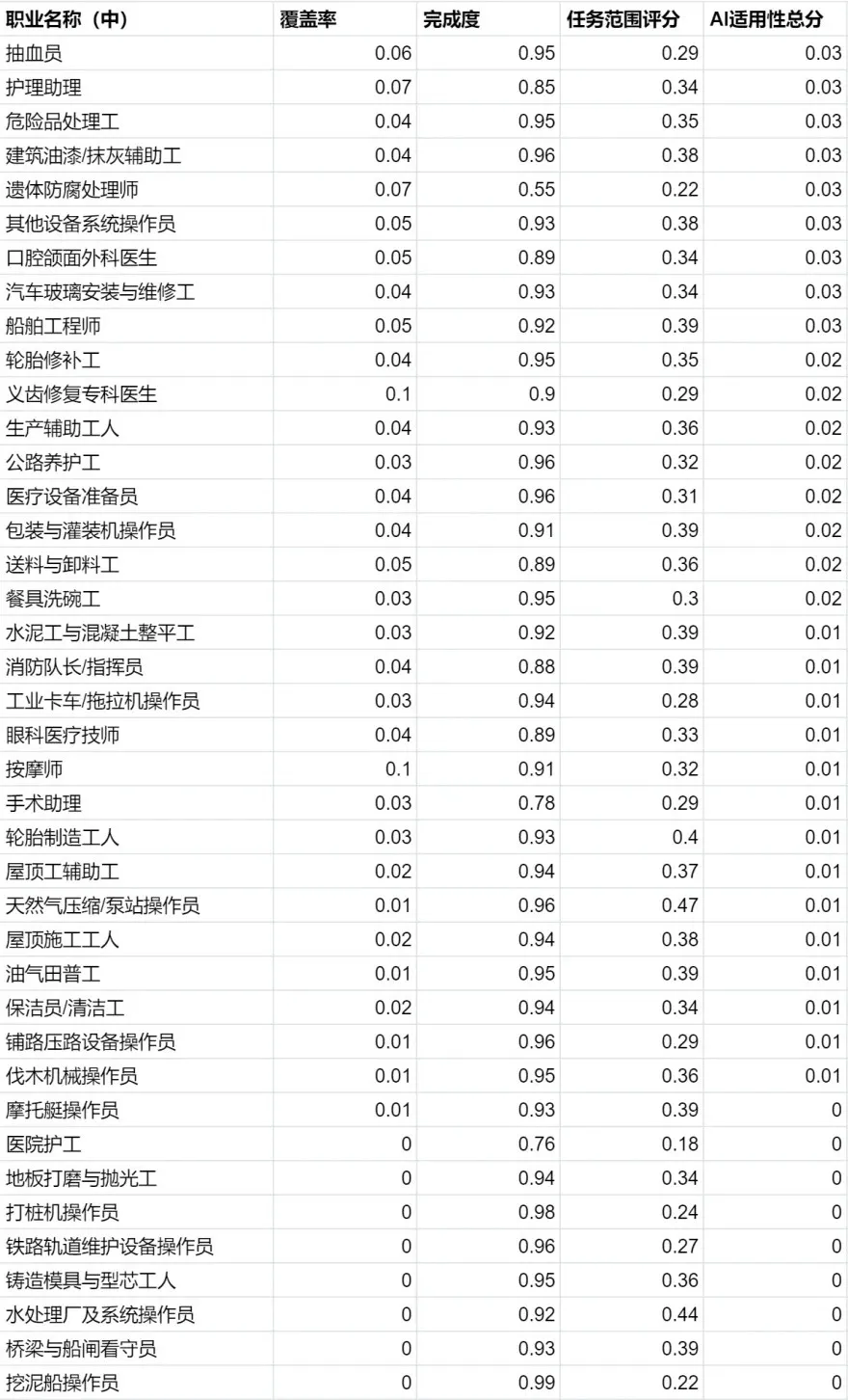 AI适用性最低的40种职业(适用性越低表示越不容易被替代)