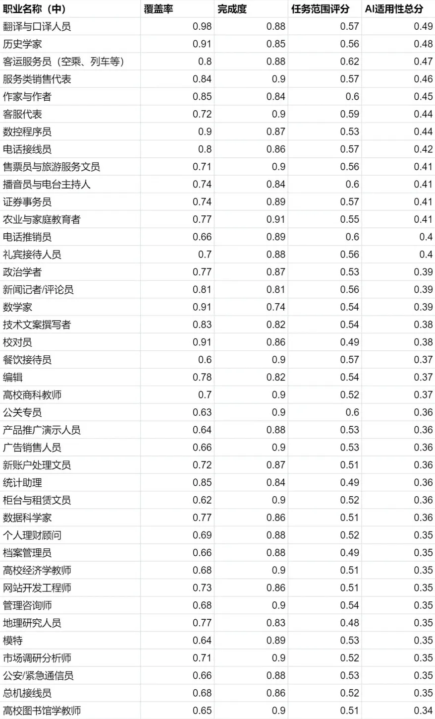 AI适用性最高的40种职业(适用性越高表示越容易被替代)