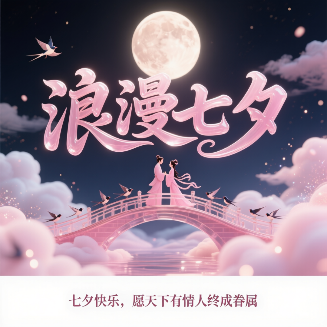 设计一张七夕海报,粉色海报设计风格,立体汉字"浪漫七夕"以行云流水的连笔书法呈现浮雕造型,材质透出温润光泽,居中正视图,背景是圆圆的月亮映衬着牛郎和织女鹊桥相会的场影,前景设置一朵朵白云飘向天空,添加粒子光效与动态模糊技术,底部设置珠光白渐变区域标注"七夕快乐,愿天下有情人钟成眷属",雕刻多层立体字结构,金属反光与透明玻璃质感,16K高分辨率。