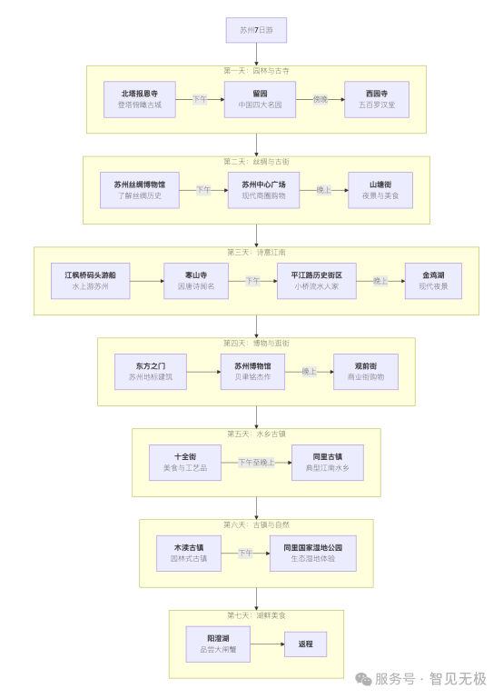 请为一家三口定制一份为期7天的苏州城市的旅游计划,需具体包含景点介绍、预算花费(含门票、平价酒店住宿和租车/交通和当地美食等)、路程或游览推荐时长,及其他注意事项;景点相对不拥挤的。生成(Html格式)旅行计划图