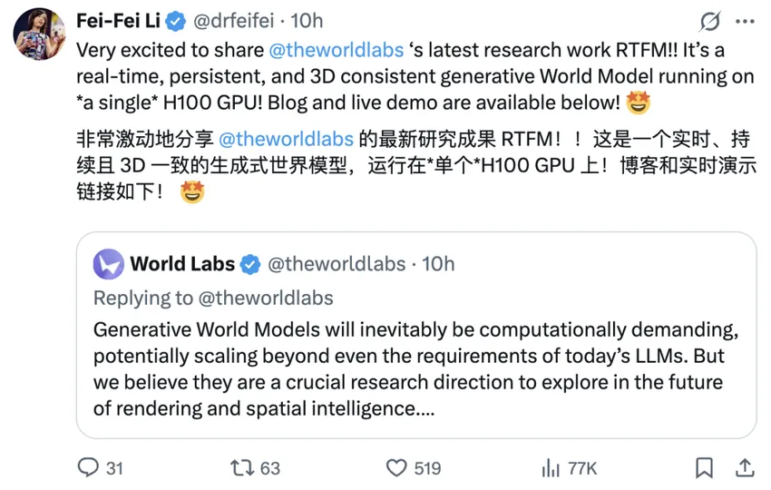 还记得上个月李飞飞教授那个创业公司World Labs搞出来的“Marble”吗?一张图就能给你造个宏大3D世界,当时就觉得够科幻了。结果!这才几天啊,他们又甩出一个王炸——RTFM模型!