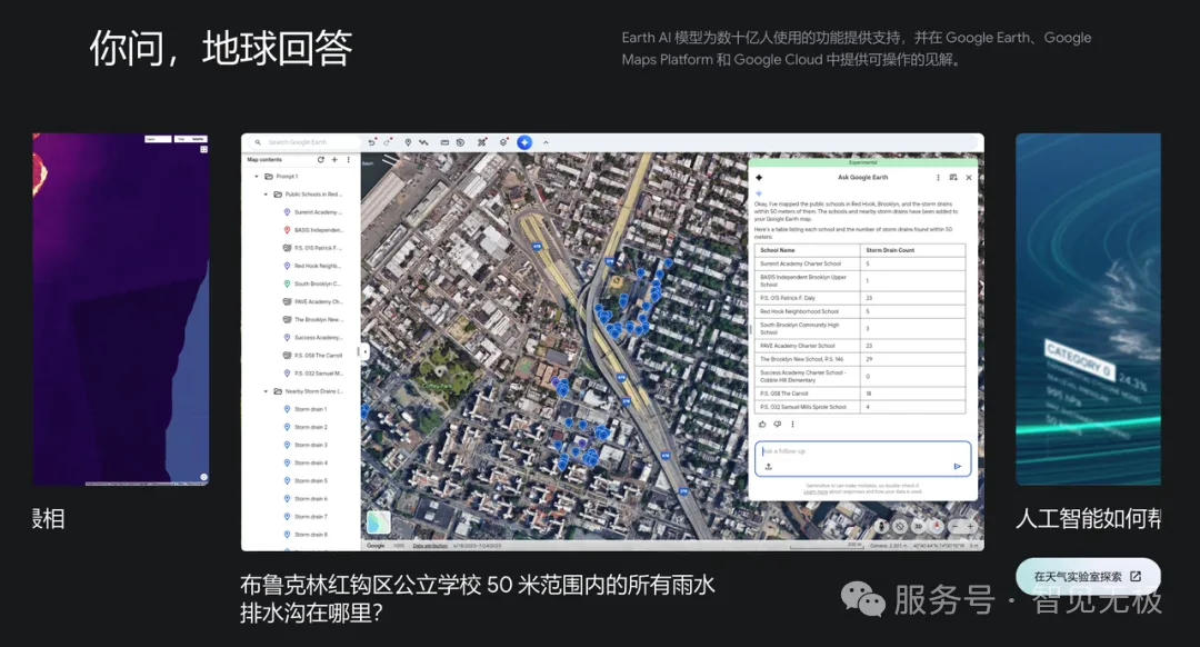 2025年10月23日,谷歌宣布升级“Google Earth AI”基础模型,将 卫星地图、气象模型、人口分布等多源地理数据 与 Gemini 大模型的推理能力相结合,用户只需提问,就能在几秒钟内得到标注、气象变化或灾害风险评估等数据结果,“一键查询”地球状态,观察森林,水体,农作物状态。