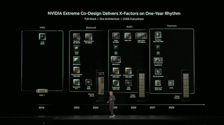 现场,老黄再次搬出了未来三年英伟达GPU路线图,从Blackwell,到Rubin,再到Feynman。