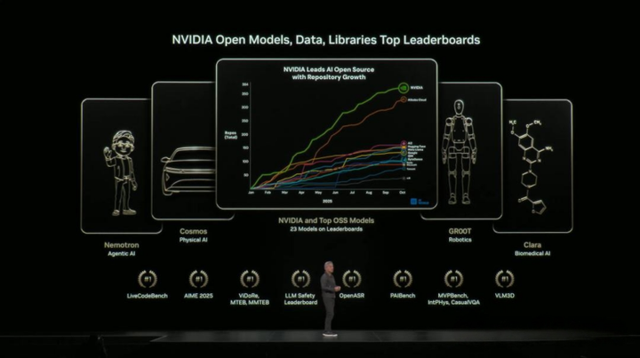 全世界,都离不开开源。目前英伟达在全球开源贡献榜上,23个模型上榜,覆盖了语言、物理AI、语音、推理等全领域。下载量也非常惊人。