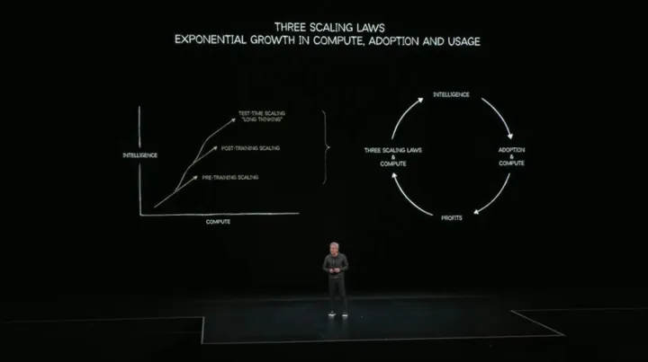 这也是老黄一直以来,反复强调的三大Scaling Law。模型越聪明,使用的人越多;用的人越多,需要的算力越多。