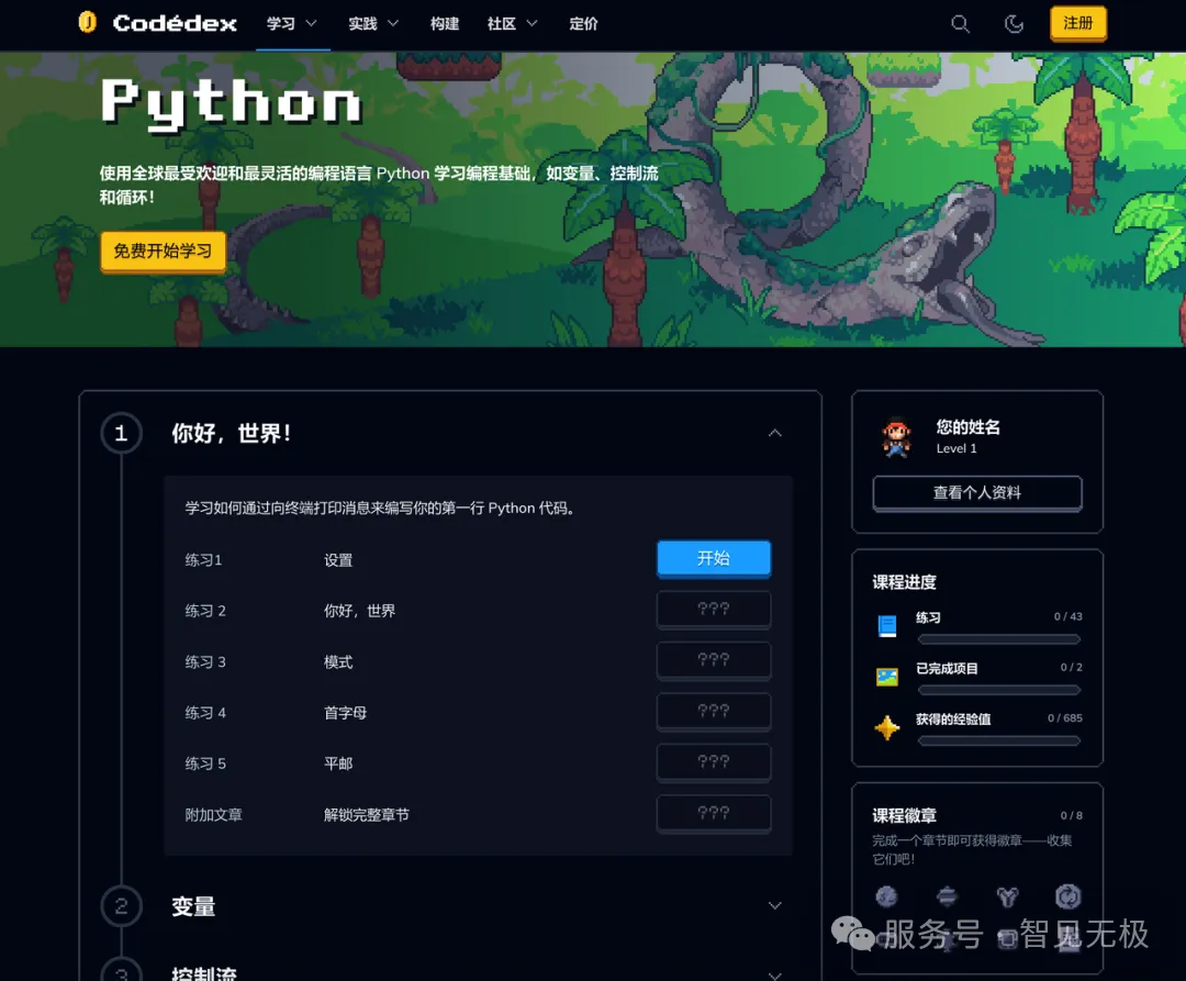今天分享一个有趣的游戏化编程学习平台——Codedex,它把编程学习做成了闯关游戏的形式,非常有意思,很适合0基础的青少年和想了解编程的大学生。