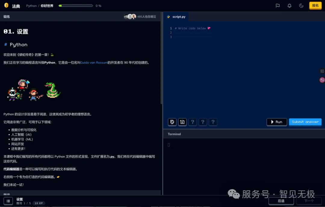 - 基础语言课程:包括Python、HTML、CSS、JavaScript等入门内容,通过“小任务+即时反馈”模式(如“打印‘Hello World’”“实现一个循环”)帮助用户快速掌握核心概念;