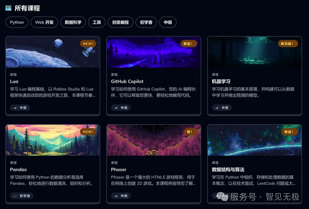 课程非常多,从基础的Python到机器学习课程全都有!