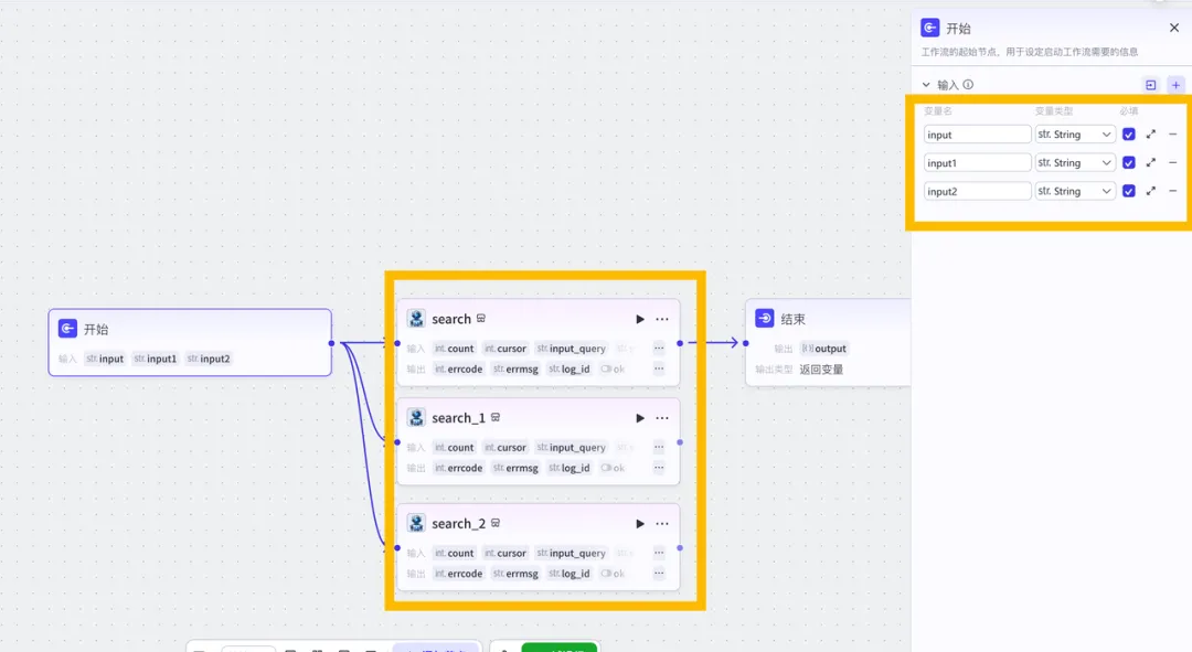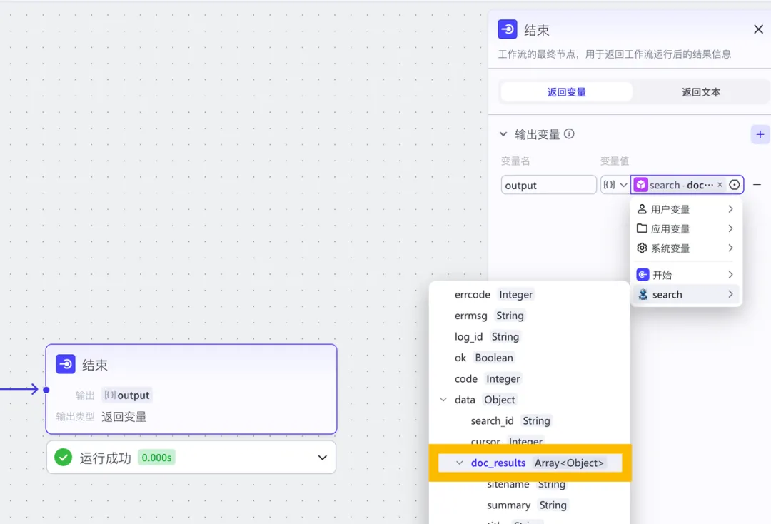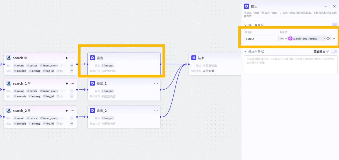 把结束连接上,设置好结束的输出变量为search的data-doc_results,同样建立三个output