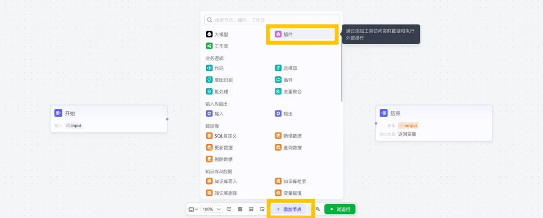 然后进入工作流页面,可以看到“开始”和“结束”两个固定的节点,我们创建第一个节点添加插件