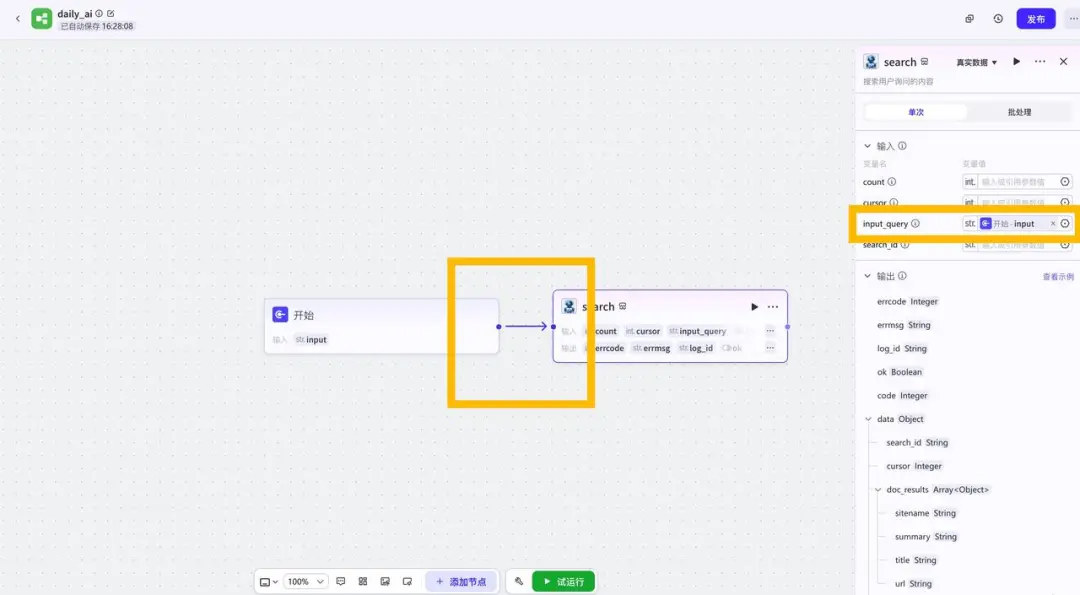 然后就是将添加的新闻和开始节点连接起来,设计搜索节点的条件,这里主要设置的是input_query,设置为开始的节点