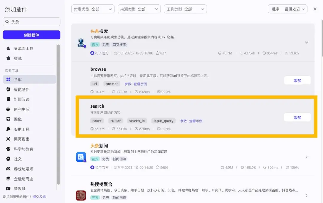 这里我要做的第一步就是先搜索新闻,所以我们先找到新闻搜索插件,添加