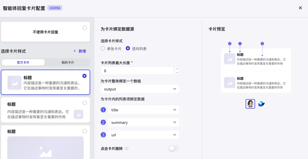 这里我选用官方卡片的“竖向”列表,设置一下卡片长度等属性,(绑定数据实在不确定就选用URL)