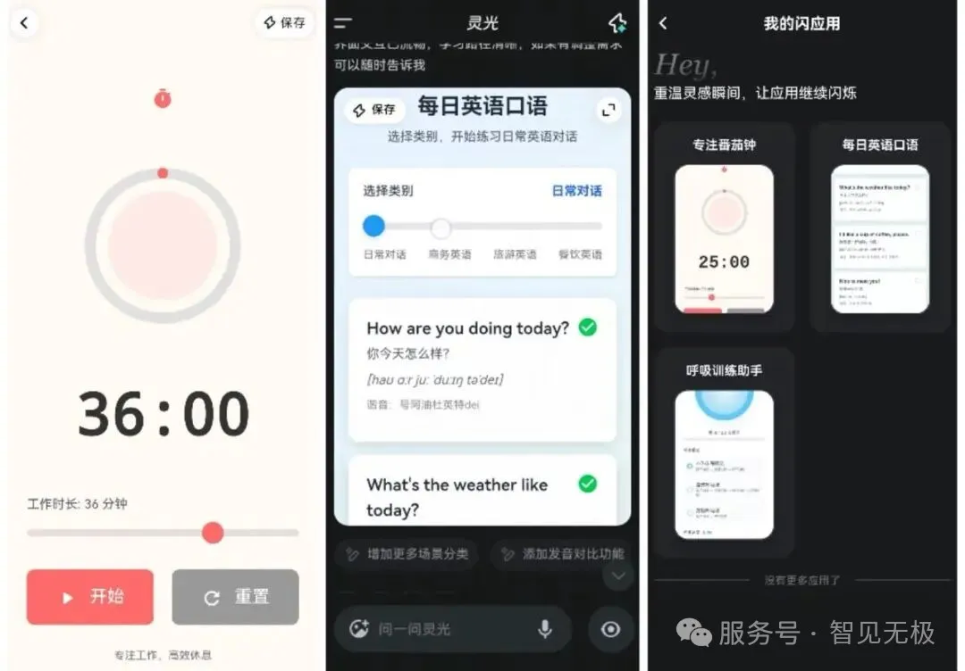 - 通过闪应用,能够将用户的想法转化为应用,实现生活中的自动化管理。目前,灵光还没有接入支付宝,但在以后,肯定会实现例如,管理订阅扣费,自动清点、关闭无用服务或更改付款周期,计算节省金额等更加实用的功能。