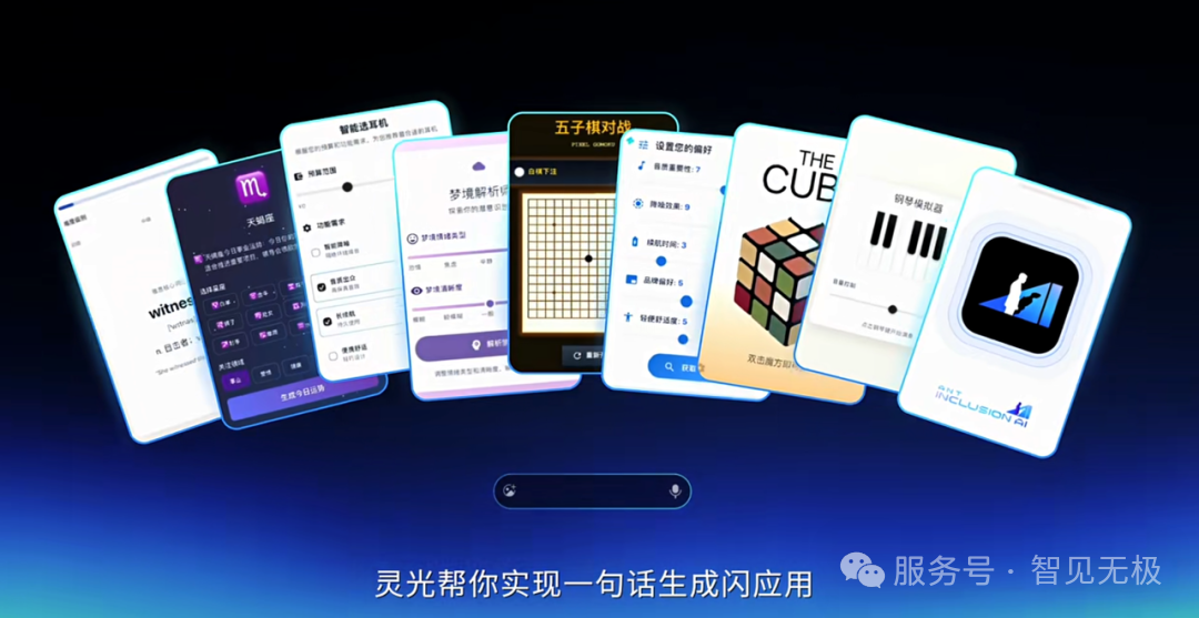“闪应用”是灵光最突出的一个功能,因为它基于全代码生成的多模态输出能力,所以能够直出小应用!
