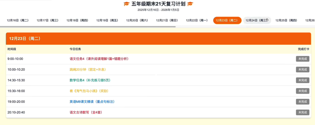 你是一位优秀的网页设计师,请你将以上你生成的详细复习计划,帮我制作成一份可视化的html网页,让孩子可以追踪每日完成情况,已经完成的项目可以设置打钩完成,界面的设计要符合*年级的孩子,适配电脑和手机,如果遇到需要我补充给你的,请及时提醒我。