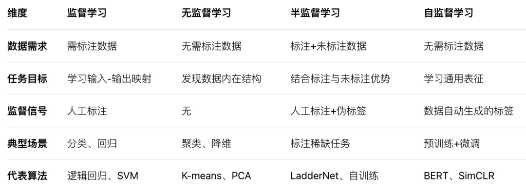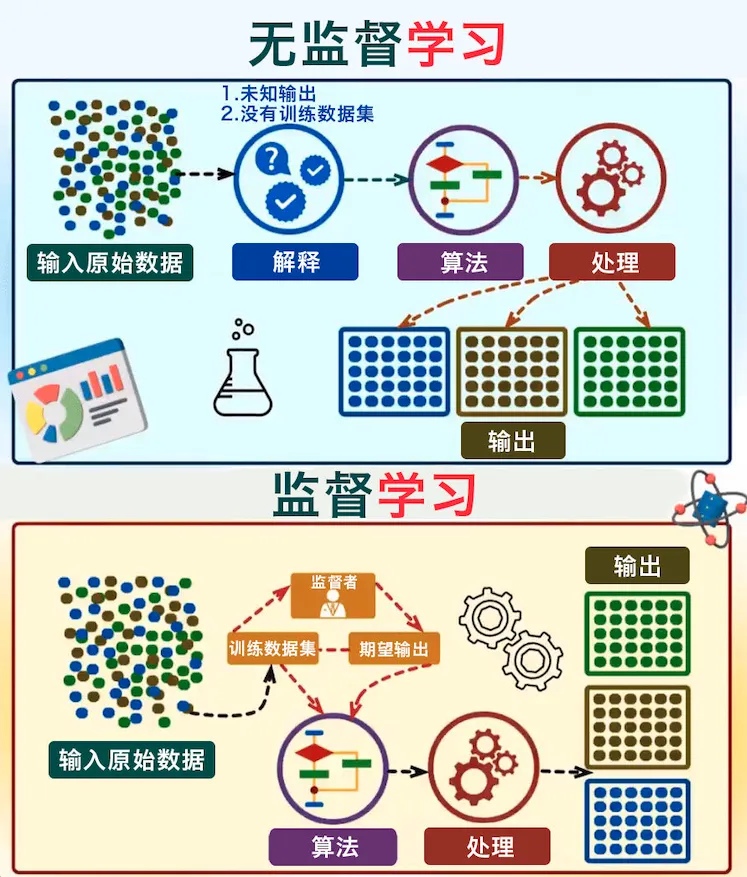 无监督学习完全无需人工标注,通过对数据内在特征的挖掘,找到样本间的关系。