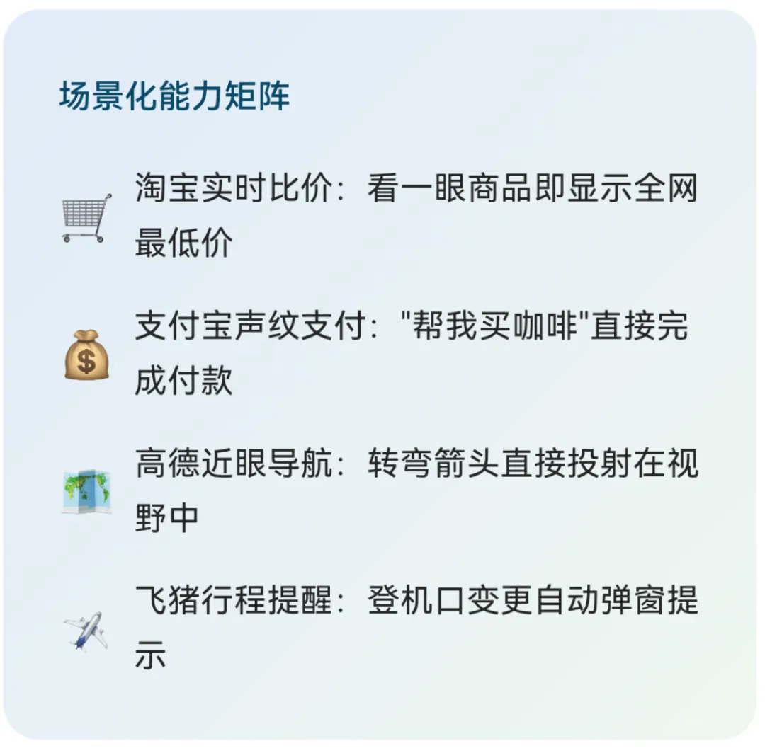 生态整合:深度整合阿里生态,支持"看一眼支付"、高德近眼导航、拍立淘商品识别等实用功能。