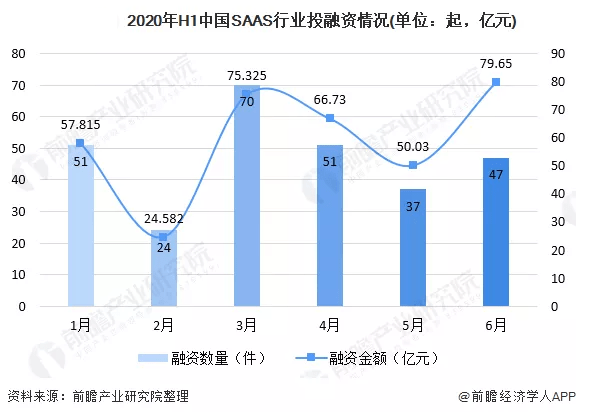 从2020年上半年的数据来看,资本市场对SaaS行业的投资热情再度高涨。根据前瞻产业研究院的整理数据,2020上半年,我国SaaS行业共发生融资事件280起,总金额达354.13亿元,特别是3月份,SaaS行业融资数量达70起,金额超过75亿元。