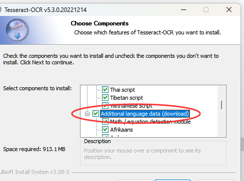 安装tesseract-ocr(OCR)软件,最新版的是tesseract-ocr-w64-setup-v5.3.0.20221214.exe ,下载地址是https://digi.bib.uni-mannheim.de/tesseract/tesseract-ocr-w64-setup-v5.3.0.20221214.exe