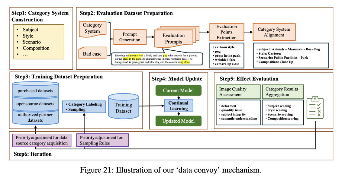 (2) 从头构建了一个数据处理pipeline,用于添加数据、过滤数据、维护数据、更新数据并应用数据来优化我们的文本到图像模型。具体来说,我们设计了一个称为“数据护航”的迭代过程来检查新数据的有效性。