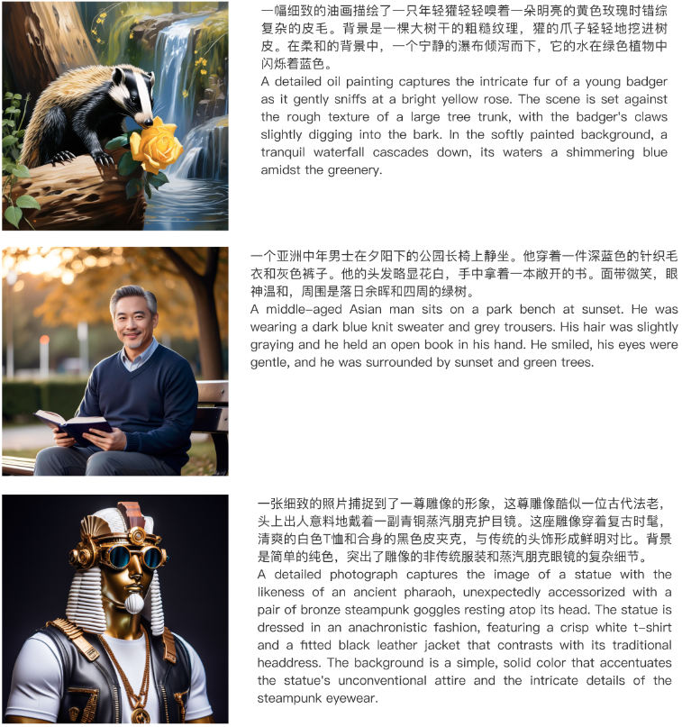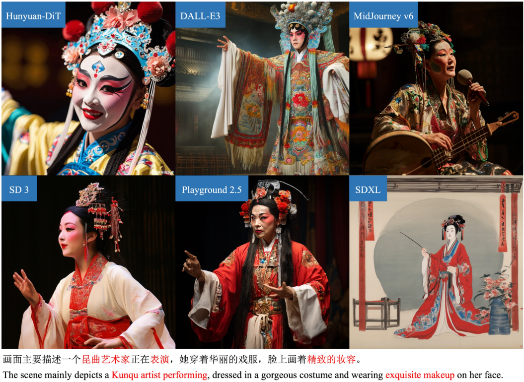 在中文元素理解方面,包括古代汉诗和中国菜等类别,Hunyuan-DiT生成的图像质量和语义准确性较其他比较算法更高。Hunyuan-DiT支持长文本理解,最多可达256个token。Hunyuan-DiT可以使用中文和英文文本提示生成图像。在本报告中,除非另有说明,所有图像均使用中文提示生成。
