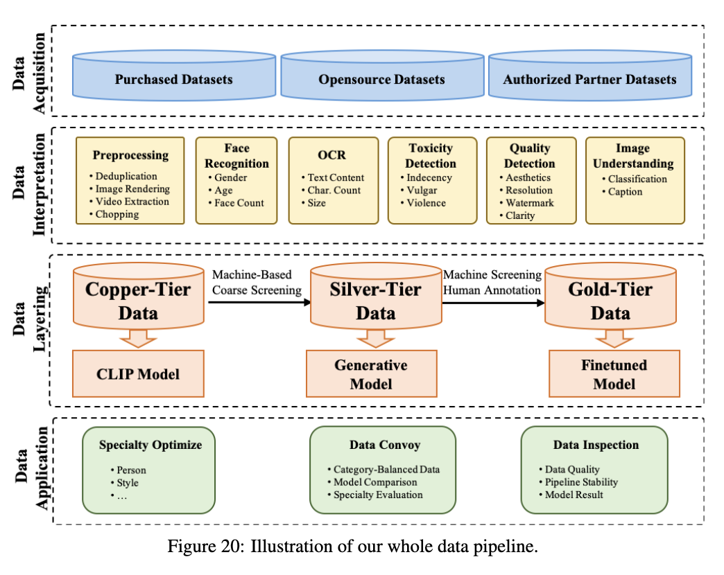 数据应用:分层数据应用于多个领域。专业数据被筛选出来用于专项优化,例如人物或风格的专业化。新处理的数据不断加入基础生成模型的迭代优化中。数据也经常被检查以保持正在进行的数据处理的质量。