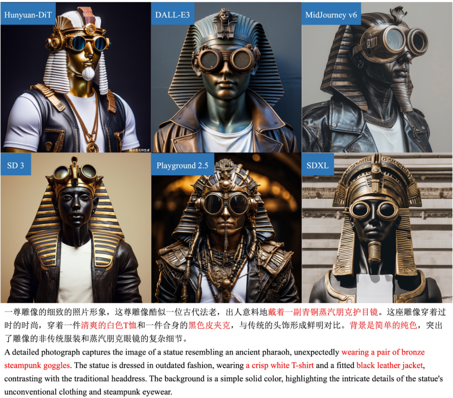 与最新技术的比较 将混沌-DiT与最新技术的模型进行了比较,包括开源模型(Playground 2.5、PixArt-α、SDXL)和闭源模型(DALL-E 3、SD 3、MidJourney v6)。遵循前面中的评估协议。所有模型都在四个维度上进行评估,包括文本-图像一致性、排除AI伪像的能力、主题清晰度和美感。如表1所示,与其他开源模型相比,Hunyuan-DiT在所有四个维度上取得了最佳得分。与闭源模型相比,Hunyuan-DiT在主题清晰度和图像美感方面可以达到与MidJourney v6和DALL-E 3等SOTA模型类似的性能。就总体通过率而言,Hunyuan-DiT在所有模型中排名第三,优于现有的开源替代方案。Hunyuan-DiT总共有15亿参数。