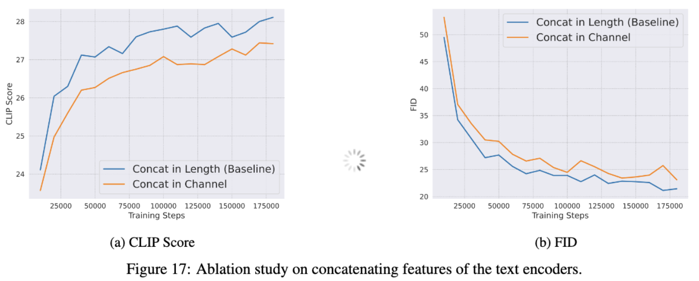 我们还在图17中探索了两种合并CLIP和T5特征的方法:沿通道维度合并和沿长度维度合并。我们发现,沿文本长度维度连接文本编码器的特征可以获得更好的性能。我们的假设是,通过沿文本长度维度连接,模型可以充分利用Transformer的全局注意力机制来聚焦于每个文本槽。这有助于更好地理解和整合T5和CLIP提供的不同维度的语义信息。