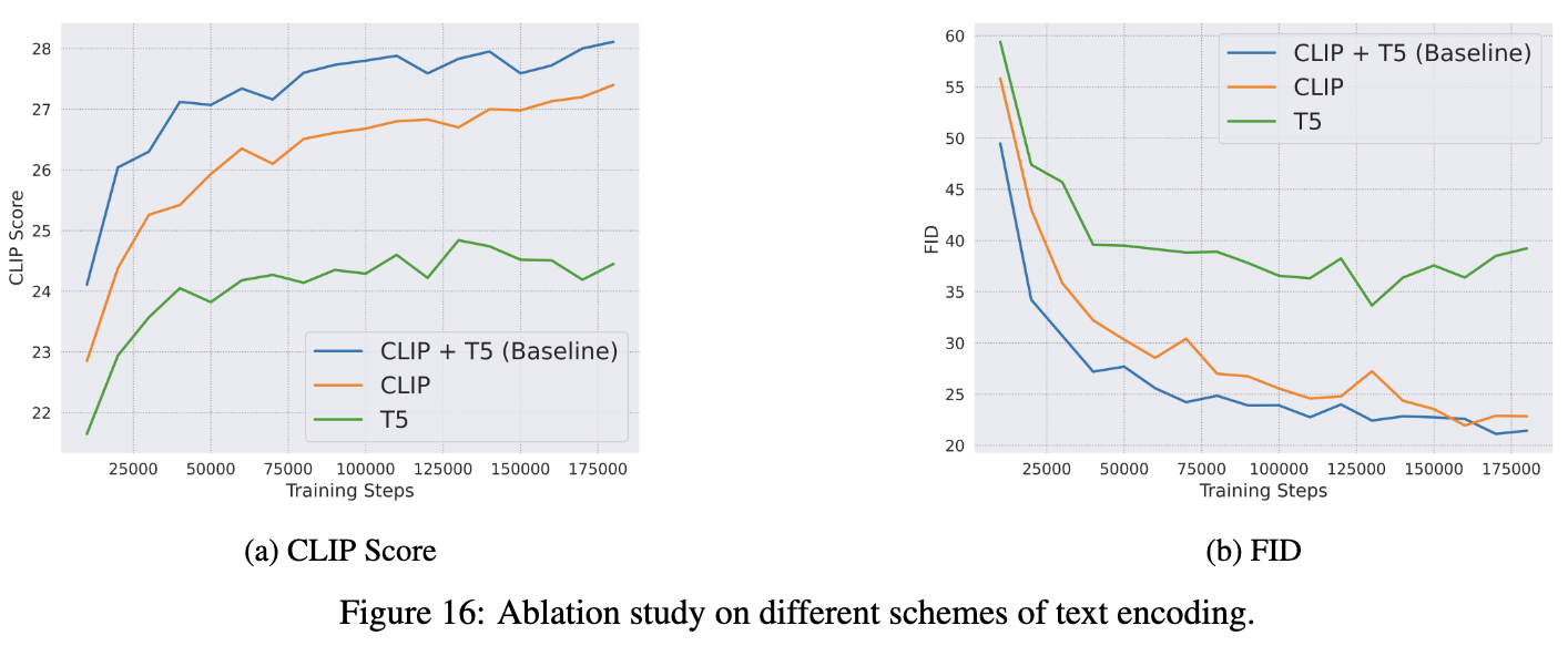 在图16中,仅使用CLIP编码器的性能优于仅使用多语言T5编码器。此外,将双语CLIP编码器与多语言T5编码器相结合,充分利用了CLIP的高效语义捕捉能力和T5的细粒度语义理解优势,导致FID和CLIP分数显著提高。
