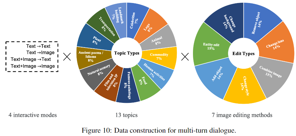 多模态多轮对话 普通的MLLM只支持文本输出。为了与我们构建多轮文本到图像生成系统的目标保持一致,我们添加了一个特殊token<draw>,表示在当前对话轮次中应将文本提示发送给Hunyuan-DiT。如果模型成功预测到<draw>token,它将为Hunyuan-DiT生成详细的提示。为了训练MLLM,我们设计了一个三轮多模态对话的数据集。为了确保对话情景的广泛覆盖,我们基于四个主要类别,即文本→文本、文本→图像、文本+图像→文本、文本+图像→图像,探索了不同的输入和输出类型的组合。通过在每次对话轮次中选择一种类型,我们预先定义了一组三轮对话的组合。对于每个组合,我们使用GPT-4生成“对话提示”,这些提示用于定义对话之前AI agent的行为,从而产生独特的对话流程。遍历了13个主题和7种图像编辑方法,在使用各种“对话提示”查询GPT-4后产生了约15,000个样本。在“对话提示”中,我们还添加了中的样本,以避免生成的文本提示的分布偏移。我们将这个三轮文本到图像对话的数据集称为。