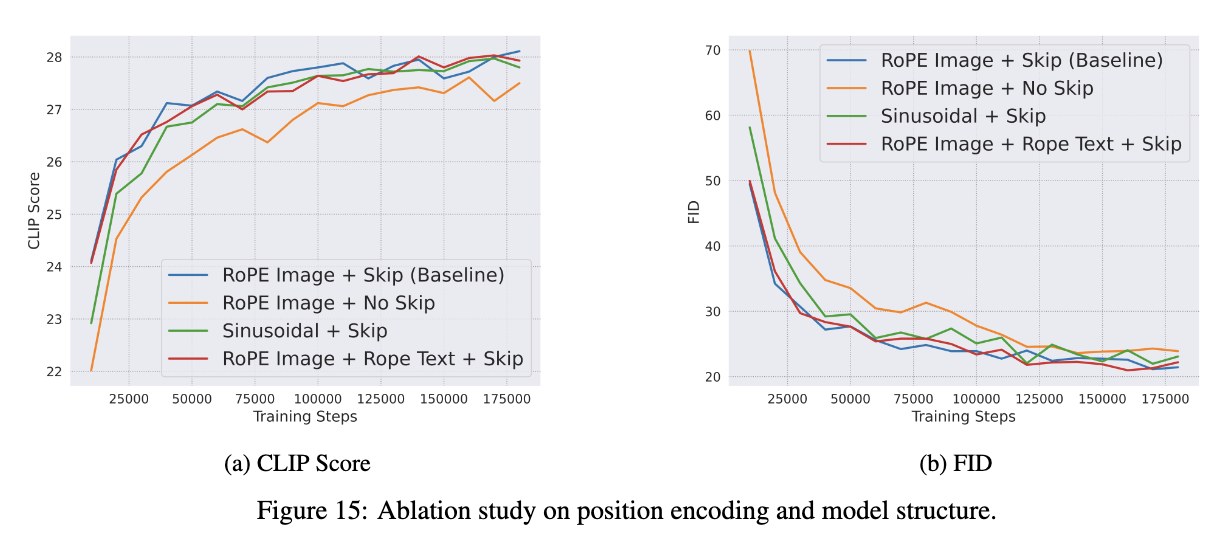 旋转位置编码(RoPE) 将正弦位置编码(DiT中的原始位置编码)与RoPE进行了比较。结果如图15所示。我们发现在大多数训练阶段,RoPE位置编码的性能优于正弦位置编码。特别是,我们发现RoPE加速了模型的收敛。我们假设这是由于RoPE能够封装绝对位置信息和相对位置信息。