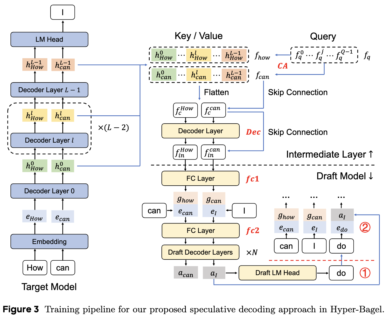 推测解码: 基于EAGLE-3范式,但针对多模态挑战进行了关键改进,设计了一个高效的中间层架构来桥接目标模型和草稿模型,提升草稿模型在复杂多模态序列中的预测准确性。