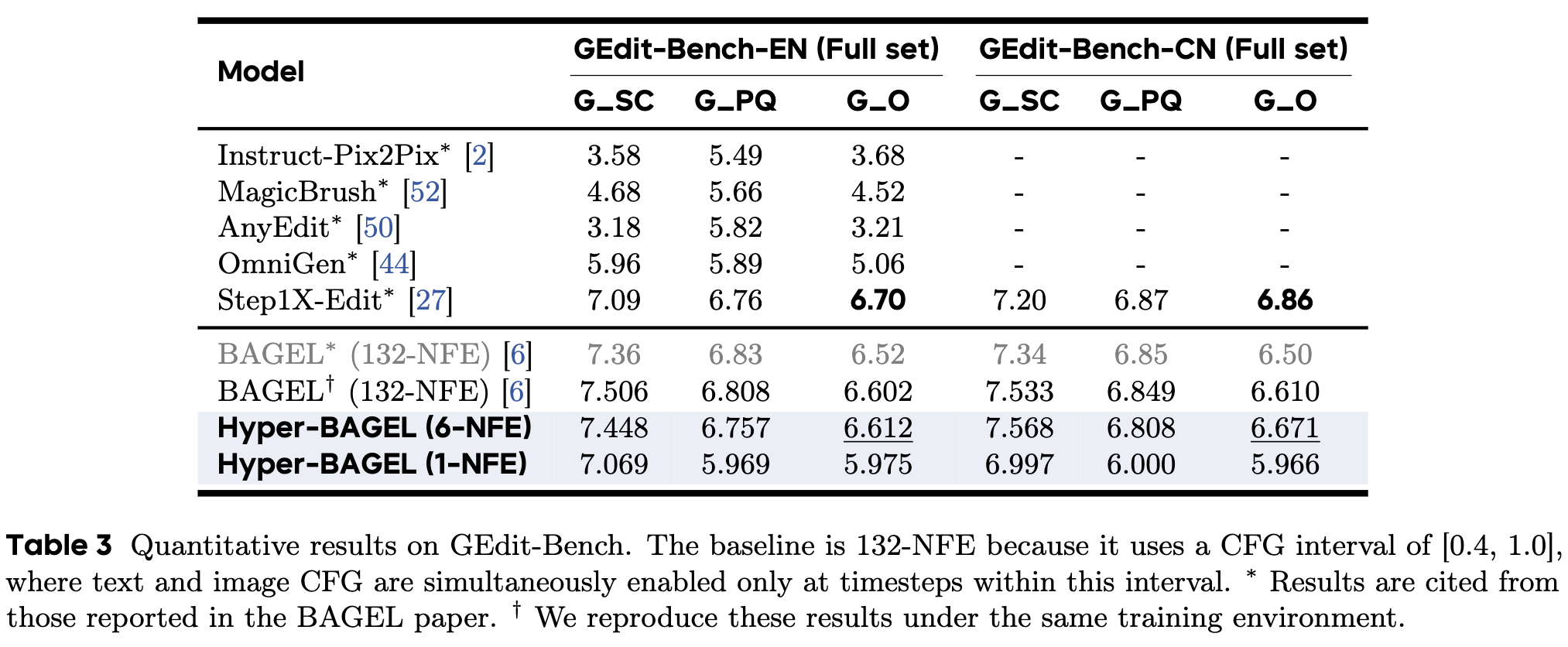 图像编辑。下图 6 展示了本文的加速模型与 132-NFE 基线在图像编辑任务中的定性性能表现。对于每个案例,6-NFE Hyper-BAGEL 模型都展示了卓越的保真度,执行了精确的编辑,例如移除花生、替换文本或消除人物,其结果与高 NFE 基线几乎无法区分。这证实了6-NFE 加速的无损特性,在提供显著加速的同时,没有任何可感知的编辑质量下降。1-NFE 模型在编辑场景中展现出一个显著优势。它能够利用源图像的结构和上下文信息,使其能够保持强大的视觉连贯性并成功应用所请求的编辑。虽然与更高 NFE 版本的模型相比,细微的细节或完美的照片真实感可能略有不足,但 1-NFE 模型仍然能提供高度可用且上下文准确的编辑,使其成为近乎实时的交互式编辑的强大工具,在这种场景下,快速模型提供的即时视觉反馈是无价的。