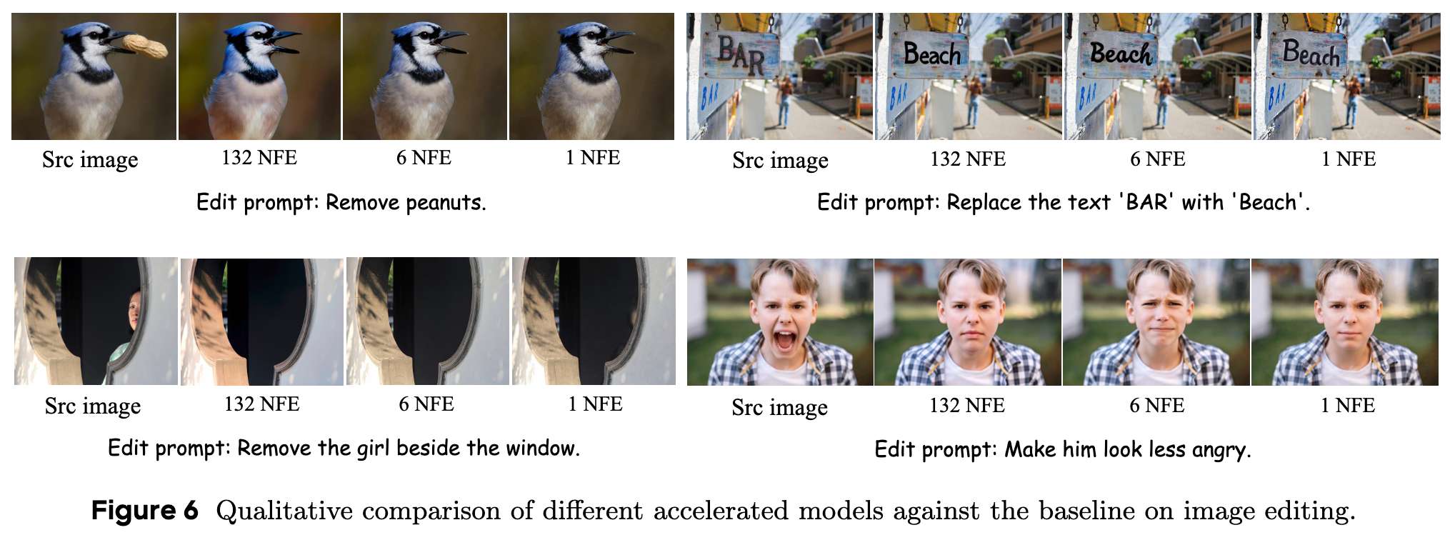进一步开发了一个高效的1-NFE模型,能够实现近乎实时的交互式编辑和生成。通过结合先进的对抗蒸馏与人类反馈学习,该模型实现了极致的成本效益和响应能力,使复杂的多模态交互变得无缝且即时。