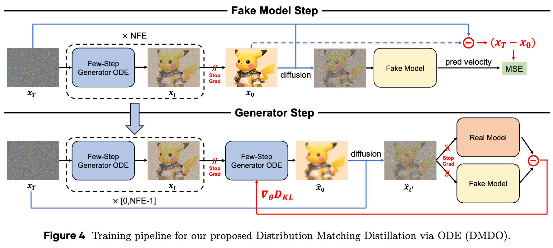 在少步生成器更新步骤中,重用伪造模型更新步骤中已有的轨迹,以帮助降低训练成本并缩短每次迭代的时间。以采样到一个落在 和 之间的时间步 为例。从轨迹中提取带噪潜在表示 ,然后再次通过启用梯度的少步生成器的 ODE 进行前向传播。在时间步 获得预测的 后,重新采样一个新的时间步 ,并与 进行线性插值以获得 ,作为伪造模型和真实模型的分数函数输入。后续的损失函数计算遵循与 DMD 相同的方法,如下图 4 所示。