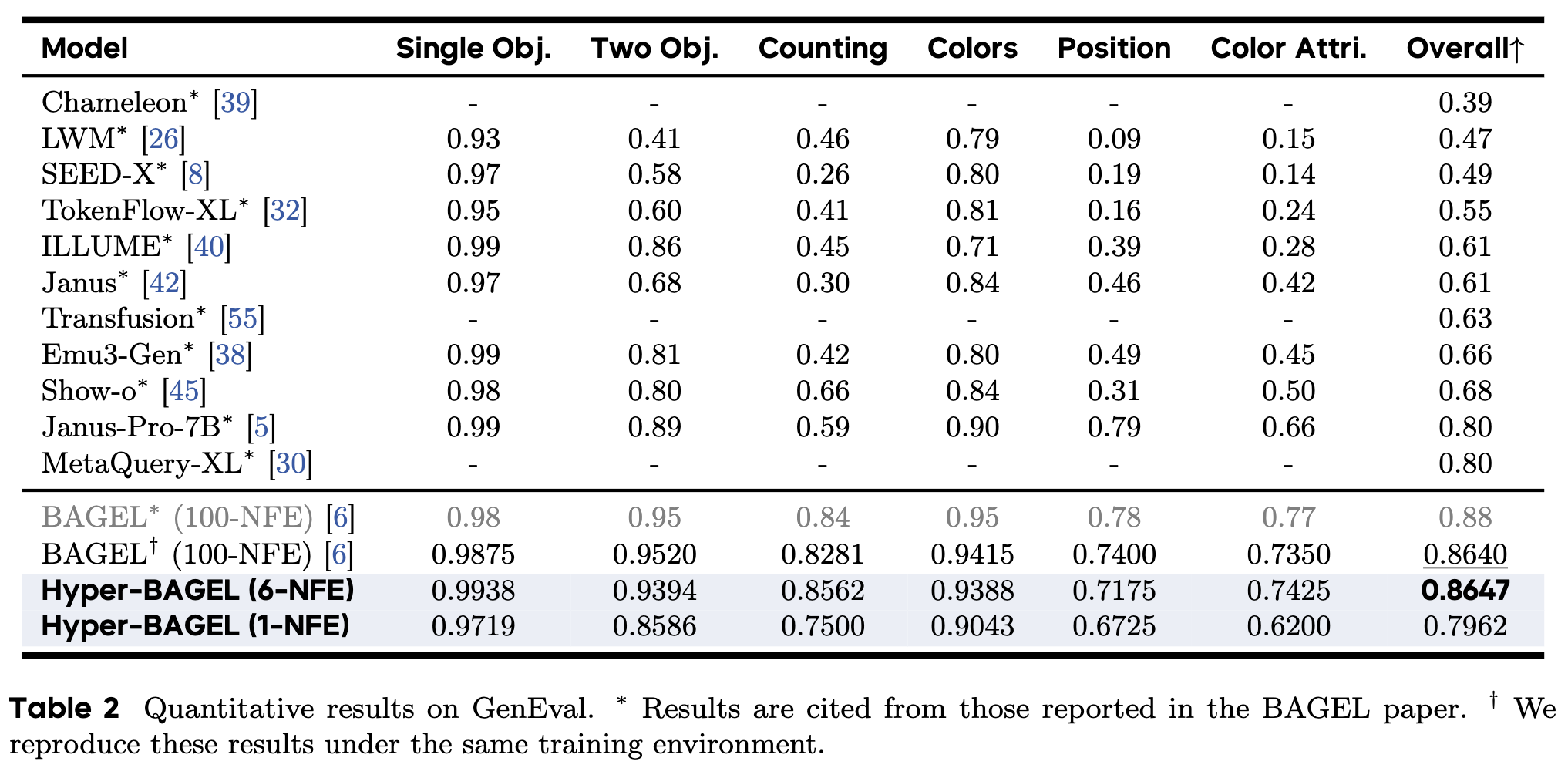 图像生成。如下表 2 所示,我们的 6-NFE Hyper-BAGEL 模型在 GenEval 基准测试中展示了无损的性能。它取得了 0.8647 的综合得分,略微超过了 100-NFE BAGEL 基线的 0.8640 分。这一结果证实了我们的蒸馏过程在将采样步数从 100 NFE 减少到 6 NFE 从而实现 16.67 倍加速的同时,并未损害生成质量。此外,高效的 1-NFE 模型与其他最先进的统一模型相比仍具有竞争力,其 0.7962 的综合得分与 Janus-Pro-7B 和 MetaQuery-XL(两者均为 0.80 分)等领先模型相当。