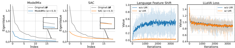 - 提出了一种名为LLaVA-c的简单但有效的持续学习方法,对LLaVA-1.5进行了两项关键改进:光谱感知整合(SAC)和无监督查询正则化(UIR)。